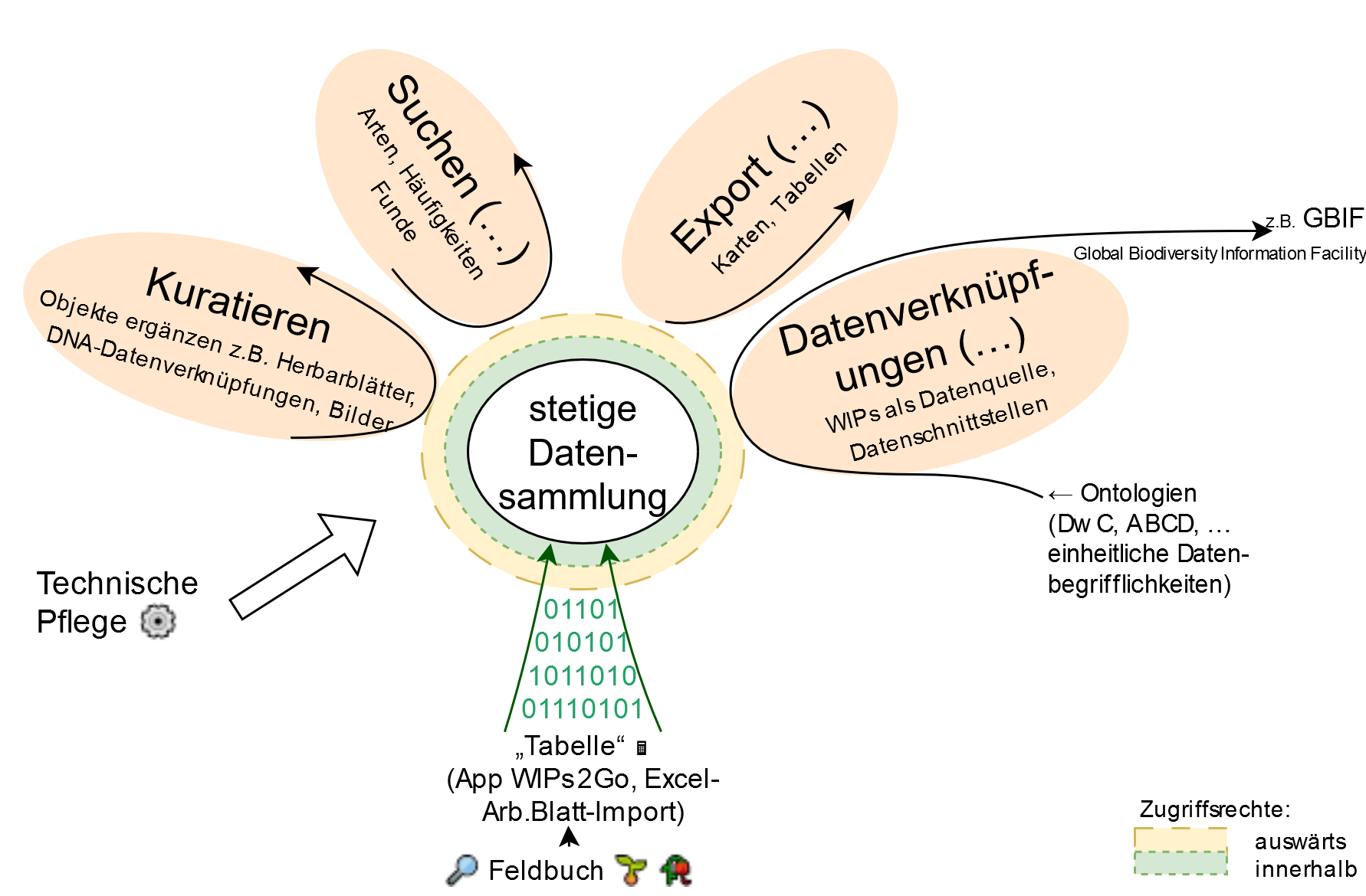 - Idealtypischer allgemeinverständlicher Datenfluss der WIPs-Daten in Blütenform: Die stetige Datensammlung umgebenden Strichellinien - - - und - - - verdeutlichen den Vertrauensbereich, um Zugriffsrechte, Befugnisse, Verwaltungsrollen usw. zu implementieren (bei schutzwürdigen Daten z.B. nur vergröberte Koordinaten exportierbar); das Implementieren von einheitlichen Ontologie-Datenbegriffen, wie Darwin Core (DwC) und Access to Biological Collection Data (ABCD), ermöglicht standardisierte Daten-Schnittstellen (=WIPs als Datenquelle)